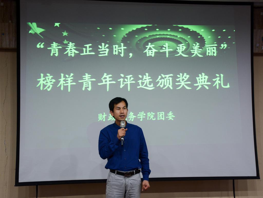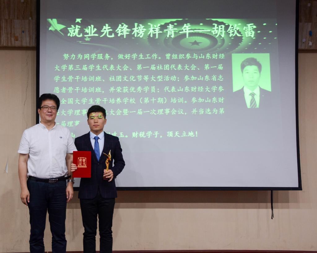 接着,“升学留学榜样青年”奖项由2015级财政学硕士孙成芳和2014级税收学六班刘晨阳获得,她们带着新时代青年的希望,靠自己辛勤的劳动换来优异的成绩。她们学有品位,学有成就,用行动践行了自己的诺言。最后一个奖项是“就业先锋榜样青年”奖项,2014级财政学三班的胡钦雷获得了 “就业先锋榜样青年”奖项。他坚信“他山之石,可以攻玉”,他用实际行动证明了他所奉行的宗旨“选好岗,稳住心,做自己”,用学识与素养打造辉煌的人生。