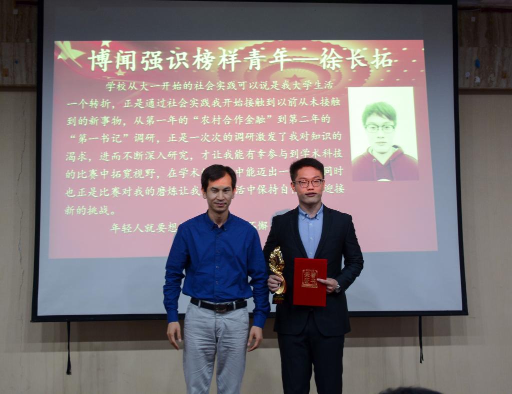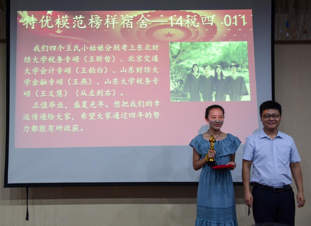 第三个进行颁发的奖项是“特优模范榜样宿舍”。2014级税收学四班011宿舍获得了该奖。干净的地面、整齐划一的用品、平整的床被、清新的空气……她们用良好的行为习惯和文明的素养打造出了快乐生活的天地。接下来,获得“博闻强识榜样青年”奖项的2015级税收学五班徐长拓向同学们展示了他的丰富经历和各项成果,并鼓励同学们到基层去,不断开拓自己的视野。第五个奖项是“社会实践榜样青年”奖项,该奖由2015级税收学三班的吴波获得,他主动参加社会实践活动,用积极的态度参融入并服务社会,取得了优异的成绩。
