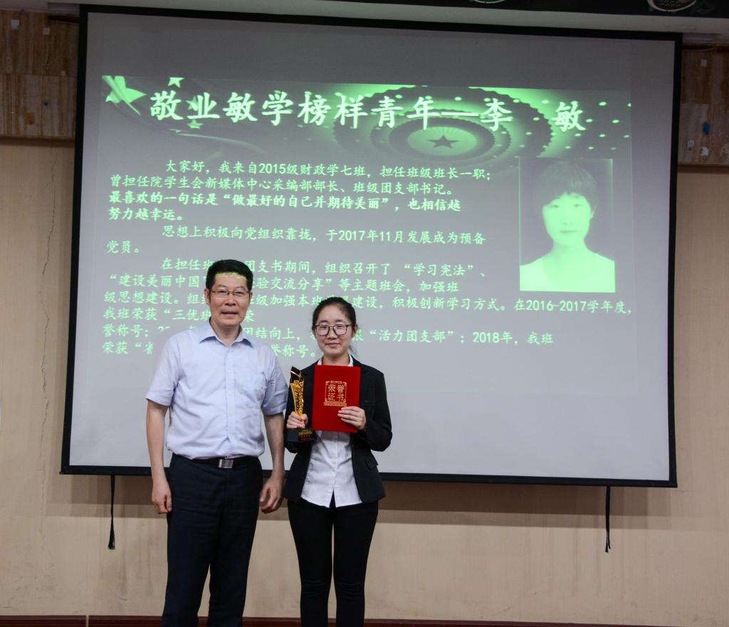 首先颁发的是“励志笃行榜样青年”奖项。经过评选,2015级税收学一班的葛畅获得此奖项。在她制作的个人视频中,葛畅同学向同学们介绍了自己的个人经历和曾获得的荣誉奖项,并建议同学们好好学习、积极参加竞赛和实践,以良好的心态取得优异的成绩。2015级财政学七班的李敏获得了“敬业敏学榜样青年”奖项。主持人对李敏进行了简单的采访。作为“敬业敏学榜样青年”,她谈到,“敬业”是指同学们在工作中要有责任心,“敏学”则是要求同学们努力学习,工作和学习并重才能全面发展。
