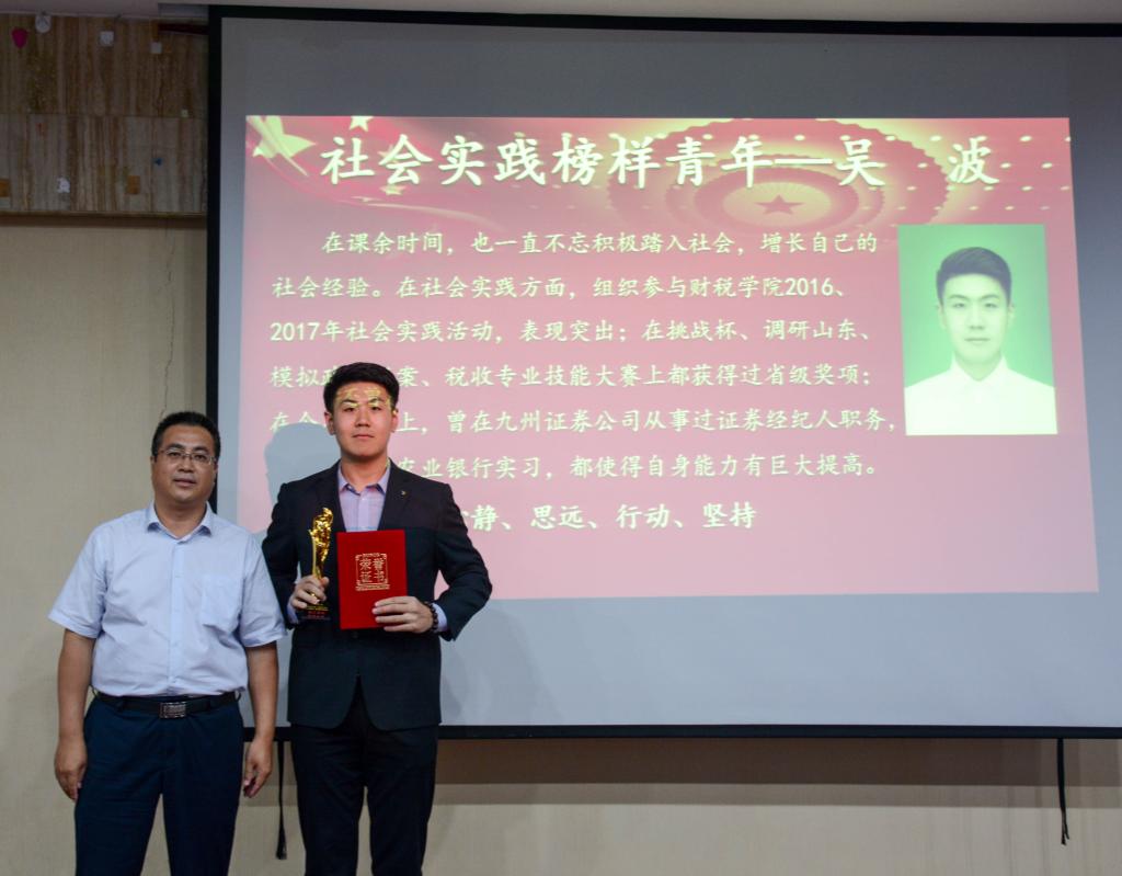 6月19日,财政税务学院“青春正当时,奋斗更美丽”榜样青年评选活动颁奖典礼在圣井校区敏行楼圆满举行。本次颁奖典礼由财政税务学院团委主办,财政税务学院学生会承办。出席本次活动的嘉宾有:山东财经大学就业指导处处长杨哲,山东财经大学党委学工部副部长孙丽华,山东财经大学团委李建强老师,财政税务学院党委书记李玉成,财政税务学院院长谢申祥,财政税务学院党委副书记张代宝,财政税务学院党委副书记梅丽萍,财政税务学院副院长马恩涛,财政税务学院办公室主任王清妍,财政税务学院财税实验室主任神方立,财政税务学院税收教研室主任郭健,财政税务学院团委书记王正一,2015级税收学辅导员程佳,2015级财政学辅导员马静,财政税务学院党委秘书、2016级财政学辅导员曹同锋,2016级税收学辅导员李子云,2017级财政学辅导员郭滨滨,2017级税收学辅导员李建永。财政税务学院学生会主席团出席了本次活动,2016级、2017级部分同学观看了本次颁奖典礼。