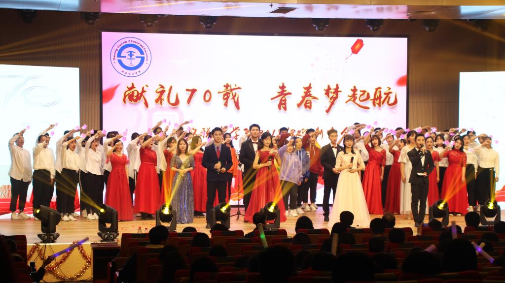 器乐合奏《Listen》作为本次晚会的开场秀,用欢快的鼓点和富有张力的嗓音,点燃了现场气氛,迎新晚会由此拉开了序幕。歌曲串烧《我想和你唱》用轻灵欢快的歌声,迸发出财税学子蓬勃的朝气。红衣翻涌、衣袂飘飘,舞蹈《华韵古典》用轻盈柔美的舞姿展现着中华古典文化的韵味。歌曲《蓝莲花》唱出了对自由的向往,对梦想的坚定。走秀《都市活力》的模特们用优雅的气质,青春的活力给现场观众带来了一场视觉盛宴。爵士舞表演《不说再见》用混合着时代与青春气息的动感舞步点燃了全场。曲艺表演《今天我来夸》通过三句半的形式,以诙谐的语言、幽默的动作逗乐了现场观众,令人拍案叫绝。器乐合奏《ChinaX变奏曲》让中西乐器齐聚一堂,融合两种迥异的音乐风格,在中国风的表现上独辟蹊径。男女二重唱《梨花又开放》将学子们对山财大的深厚感情融于歌声中,在每位财税学子的心中引发了共鸣。舞蹈《花儿红》由我院新疆籍维吾尔族学子倾情奉献,曼妙的舞姿与充满异域风情的服装引领观众走近大美新疆,使来自祖国各地的学子们凝聚在一起。合唱《相遇财税》由2019级财政学四班李少军重新填词,2018级全体代班演唱,讲述了学子们与财政税务学院的故事。朗诵《我的祖国》将祖国成立70年的砥砺前行与崛地起而娓娓道来,铿锵有力的话语让每位财税学子心中涌起无限感慨。歌伴舞与走秀《大唐英姿》、舞蹈串烧《Angles & Boys》展示了财税学子多元的形象,引得全场欢呼喝彩。大合唱《我和我的祖国》用阿卡贝拉的新颖形式表达了财税学子对祖国繁荣昌盛的衷心祝愿,诠释了财税学子对祖国的热爱,展现了学子们的爱国情怀。歌曲《仰望星空》表达了2019级新生对美好大学生活的向往,对理想信念的追求。最后,晚会在《仰望星空》的优美旋律中落下帷幕。晚会结束后,学院领导老师、校友们上台与演员合影留念,让今晚的美好定格在此刻。