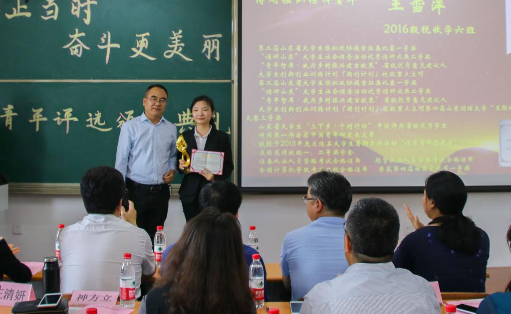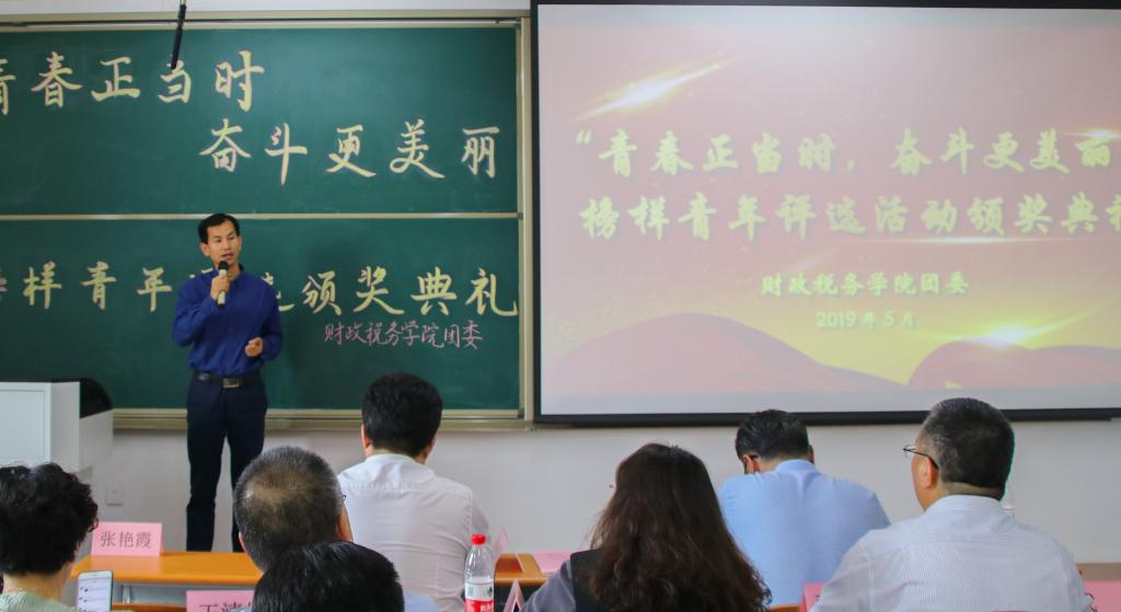 5月16日,财政税务学院第二届“青春正当时,奋斗更美丽”榜样青年评选活动颁奖典礼在圣井校区七号教学楼圆满举行。本次颁奖典礼由财政税务学院团委主办,财政税务学院学生会秘书处承办。出席本次活动的嘉宾有:山东财经大学就业指导处处长杨哲,山东财经大学党委学工部副部长张慧,山东财经大学团委副书记甘超,山东财经大学党委宣传部副部长张艳霞,山东财经大学教务处副处长孙德昌,财政税务学院院长谢申祥,财政税务学院党委副书记张代宝,财政税务学院办公室主任王清妍,财政税务学院财税实验室主任神方立,财政税务学院财政教研室副主任武彬,财政税务学院全体辅导员老师。财政税务学院学生会主席团成员、校学生会代表及各院学生会代表出席了本次颁奖典礼,2018级部分同学观看了本次典礼。