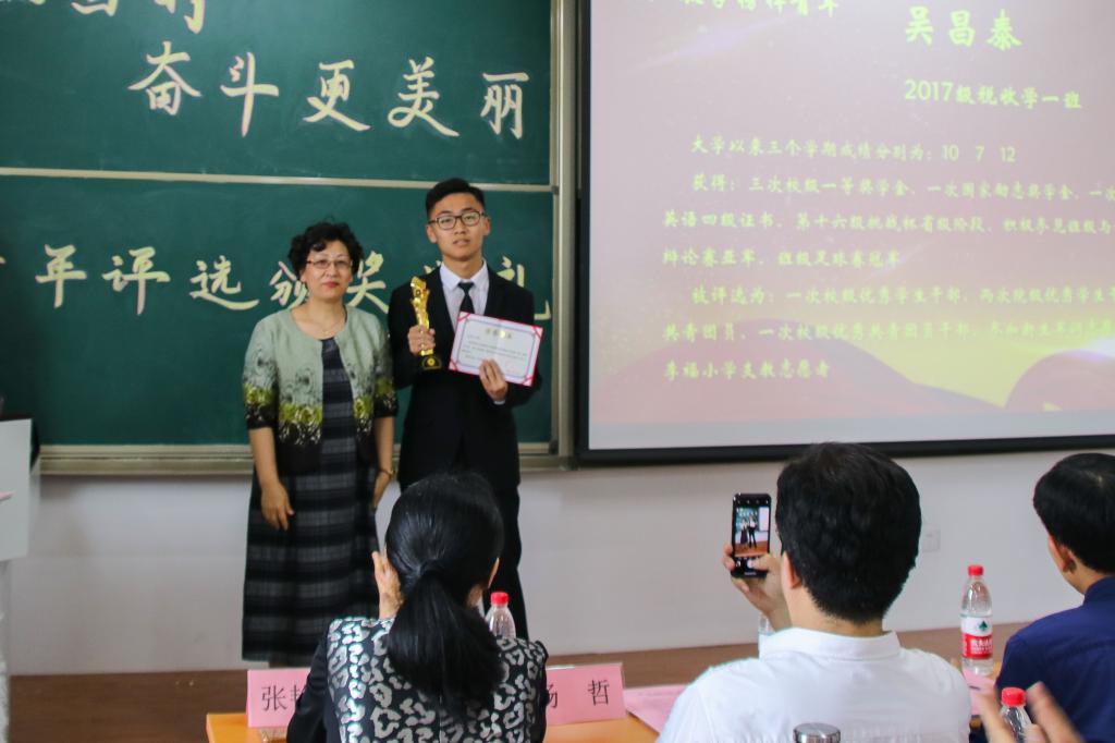 接下来,由各位老师为获得提名奖的同学们颁奖。上台领奖的同学有“励志笃行榜样青年”提名奖获得者2016级财政学一班莫益亮,“敬业敏学榜样青年”提名奖获得者2018级财政学四班谢源一琦,“特优模范榜样宿舍”提名奖得者为圣井校区33322宿舍,“博闻强识榜样青年”提名奖获得者2017级财政学五班张文善,“社会实践榜样青年”提名奖获得者2012级财政学三班李丽云,“校园文化榜样青年”提名奖获得者2017级财政学三班陈晓钰,“志愿服务榜样团队”提名奖获得者鲁能志愿者服务团队,“宣传活动榜样青年”提名奖获得者2017级财政学一班曹元荷。