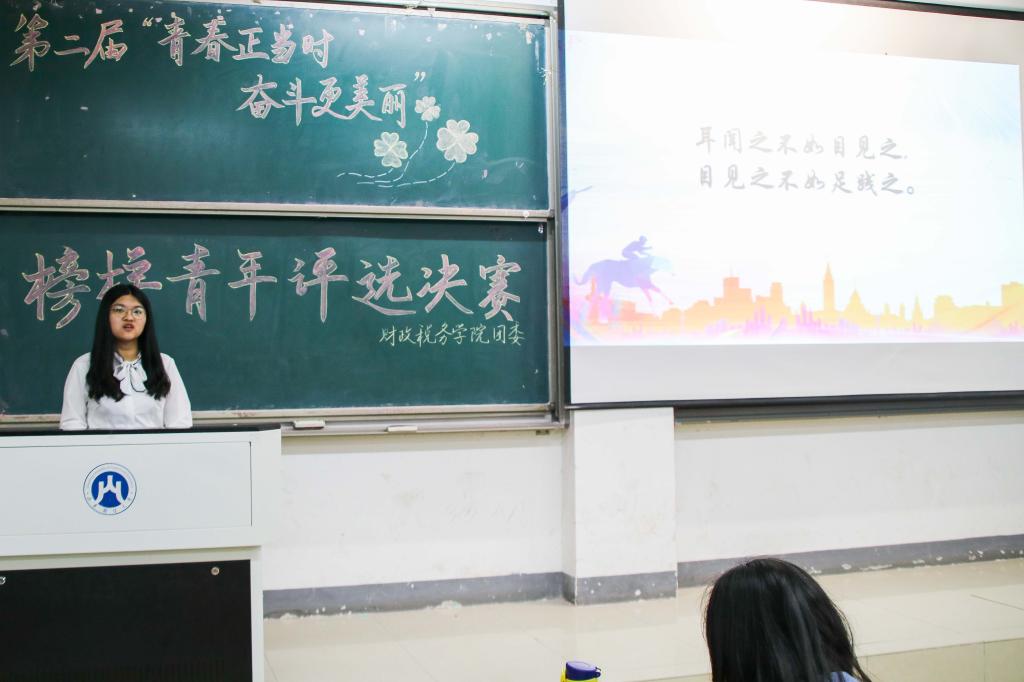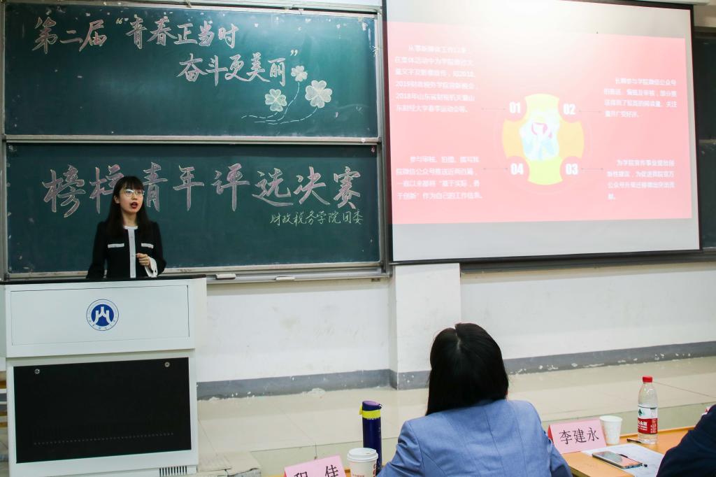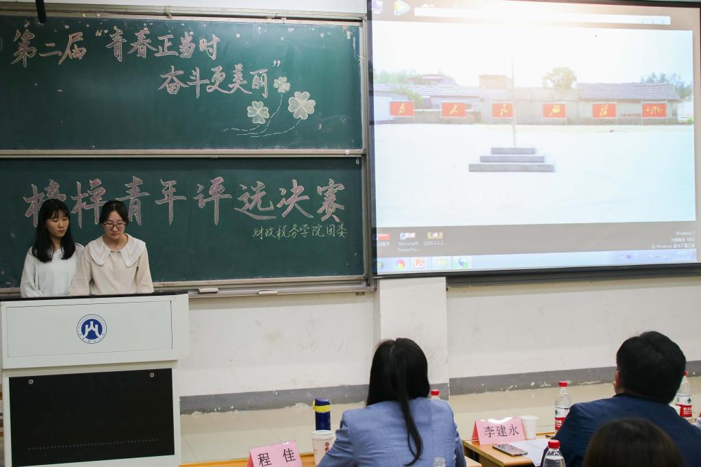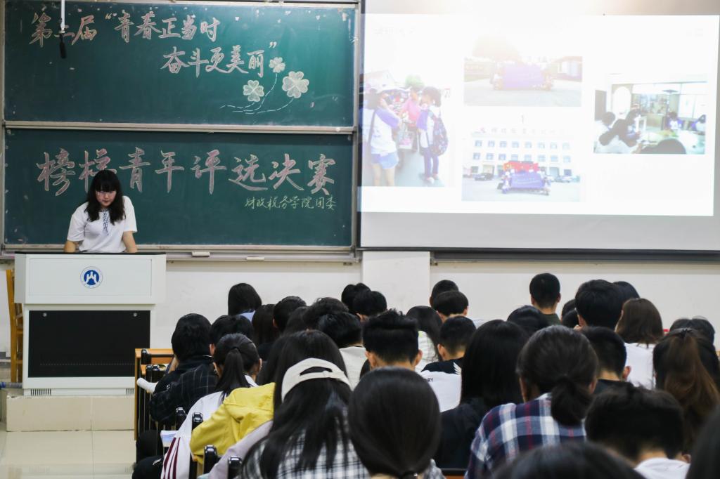 最后上场的是宣传活动榜样青年候选人2017级财政学六班郑昊晨和2017级财政学一班曹元荷。他们向观众们介绍了宣传工作对于学院的重要意义,以学院微信公众号等途径向同学们及时传递校园内的各类资讯,宣传学院文化。他们强调宣传工作是一种看似简单而又不简单的工作,在学院的建设中发挥着不可替代的巨大作用。