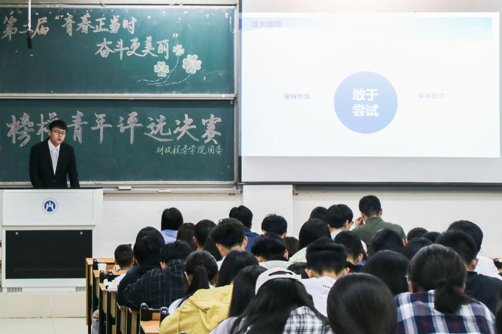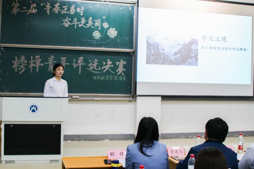 第四个上场的是博闻强识榜样青年候选人2016级税收学六班王雪萍和2017级财政学五班张文善。在认真学习校内课程的同时,他们广泛学习课外知识,并取得突出成绩。不仅如此,候选人们还广泛参加各类知识竞赛开拓自己的视野,掌握各类计算机软件应用来增强自身能力。他们认为在课余时间学习课外知识有利于自己增长见识,扩大知识面,对日后继续深造或是参加工作以后都具有重要意义。