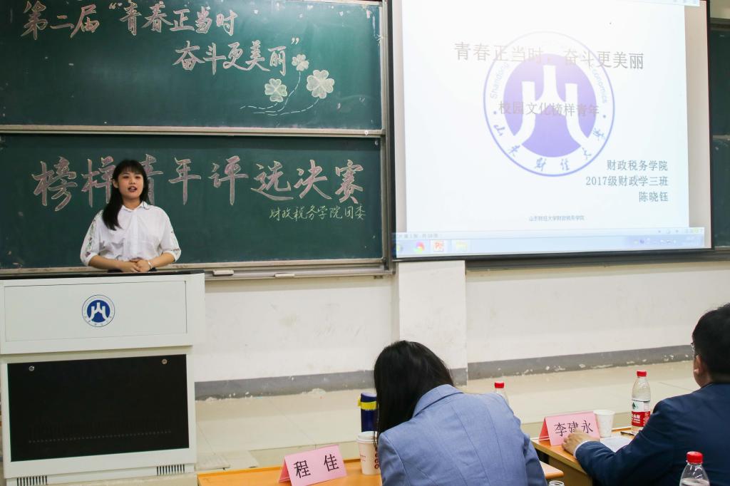 第六个上场的是校园文化榜样青年候选人2017级税收学一班刘丰华和2017级财政学三班陈晓钰。他们提及了自己参加的各类校园文化活动,例如参加迎新晚会节目选拔、参与校园歌舞比赛等,他们用自己的努力装点了同学们的校园生活。他们认为校园文化是同学们校园生活的重要组成部分,能给同学们的学习生活带来欢声笑语,让校园变得多姿多彩。