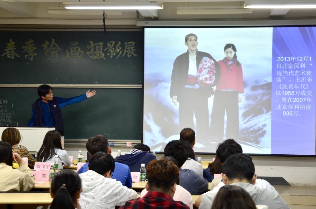当所有手机组作品展示完毕之后,由武普照老师作了总结发言。首先,武老师指出大家要选择适当的时间进行摄影创作,以上午七八点和下午四五点为最佳。中午阳光过于明亮,会减弱作品的立体感和层次感,而晚上拍摄的作品光感和色彩较差。接着,他为大家讲解了摄影的初始功能、发展史,并通过摄影和绘画艺术特点的比较指出了它们各自的发展方向。最后,武老师还向同学们传授了冲击力、色彩运用、趣味点设置等摄影的十大要诀。