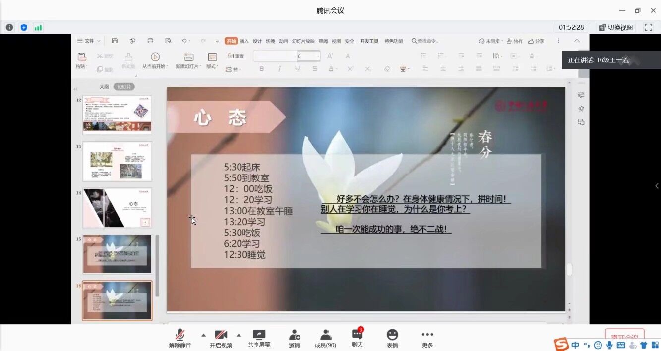 本次活动旨在为备战考研的同学分享考研经验与方法,为同学们的漫漫考研路指明方向和奋斗目标,帮助同学们进一步提升自己、实现梦想。活动伊始,主持人介绍了本次活动的流程及具体内容。随后,受邀同学依次分享了他们的心得体会。