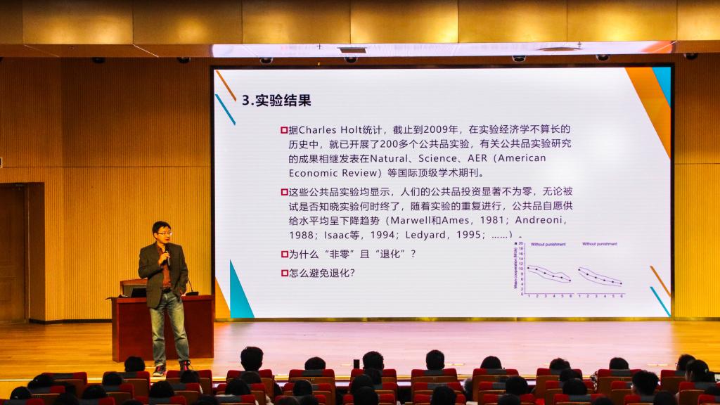 汪崇金老师的讲座内容分为“实验设计”“实验过程”“实验结果”“实验解释”以及“实验启示”五个部分。讲座伊始,汪崇金老师以财政学中经典博弈——“公共品博弈”入手,介绍了公共品的非竞争性和非排他性的特质,提出公共品自愿供给过程中的搭便车问题,给同学们留下一个悬念,即“你在面临搭便车诱惑时,会自愿贡献公共品吗?”。随后,汪崇金老师详细介绍了公共品实验的设计,并运用互联网技术开展了一项公共品实验,以验证同学们的真实选择。汪老师结合自己以往开展的实验结果,以及《Nature》《Science》《经济研究》等经典文献的实验结论,概况了公共品自愿供给情境中人们的平均贡献量呈“非零”和“退化”两个基本特征,并运用强互惠理论中的条件性合作偏好假设解释了这些实验现象。接着,汪崇金老师提出一个问题,即如何避免公共品实验中平均贡献量的“退化”?他从身边的插队、闯红灯、随地扔垃圾等破坏合作规范的小事说起,引出一些人有对不合作行为实施利他性惩罚的倾向。同时向同学们分享了国际顶级期刊上的具有利他性惩罚机会的公共品实验结论以及自己的研究成果,展示了利他性惩罚在有些国家的实验中能够避免合作“退化”。无论是条件性合作还是利他性惩罚,与追求个人利益最大化的经济人假设并不一致,为此,汪崇金老师介绍了人脑三结构,并介绍了《Science》等顶尖期刊上的研究成果,从而从脑科学方面解释了人们的合作行为。