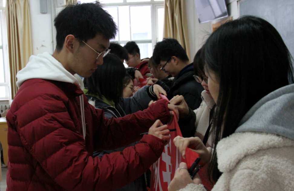 为了坚定同学们诚信应考的信念,考评委助理刘潇涵带领全体学生进行诚信宣誓。摒弃侥幸之念,厚积分秒之功,大会在同学们庄严宣誓中落下帷幕。各班班长、团支书代表本班学生在诚信条幅上签字。