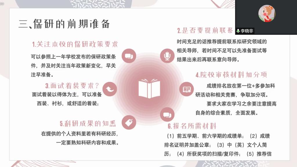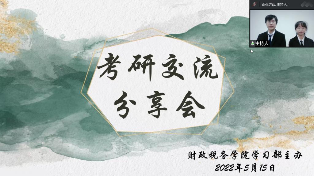 5月14日至5月15日,财政税务学院“扬帆筑梦,研途有我”线上考研交流分享活动圆满举行。本次活动由财政税务学院主办,财政税务学院学习部承办。此次活动旨在帮助同学们更好地做好考研规划和解答考研过程中的疑惑,为同学们指明考研方向和奋斗目标。2018级获得推免资格的和考取各院校硕士研究生的学生代表受邀出席本次活动,2019级、2020级部分同学参与本次活动。