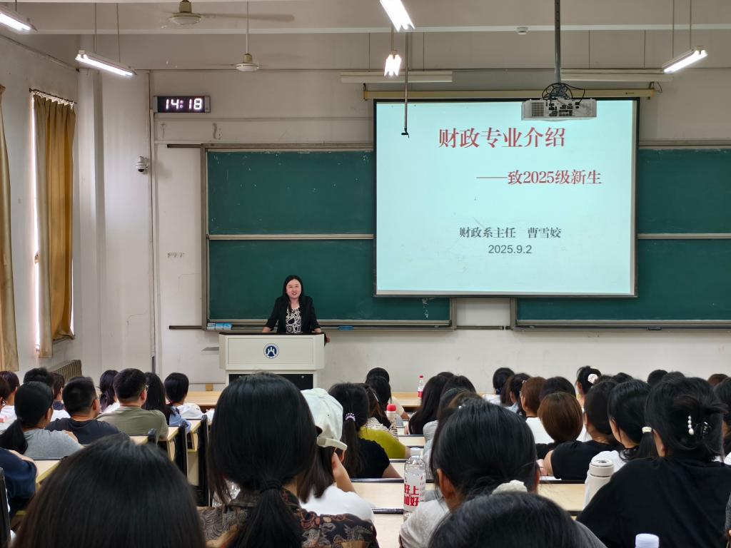 财政系主任曹雪姣为2025级财政学新生开展专业介绍讲座,讲解了财政的定义与存在必要性。她向同学们介绍了我院专业学科实力,点明学业发展要求。此外,她还提及数字时代需具备的核心素质,给出考研、考公、企业就业等方向建议,鼓励新生结合个人专业能力与国家需求规划未来。