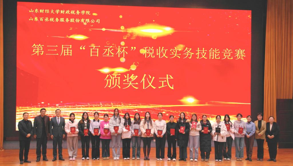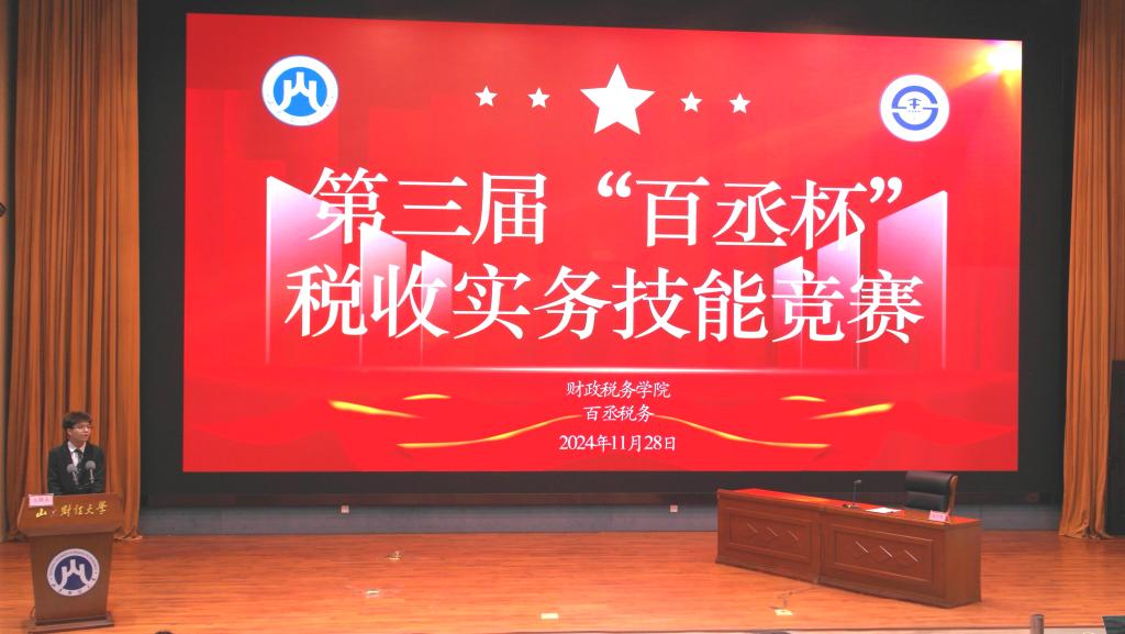 11月28日,财政税务学院第三届“百丞杯”税收实务技能竞赛于圣井校区图书馆报告厅圆满落下帷幕。山东百丞税务服务股份有限公司总经理董华、合伙人田峥峥,财政税务学院院长李森、党委副书记滕晖、副院长赵宝廷,税收系主任马静和部分师生出席本次比赛。