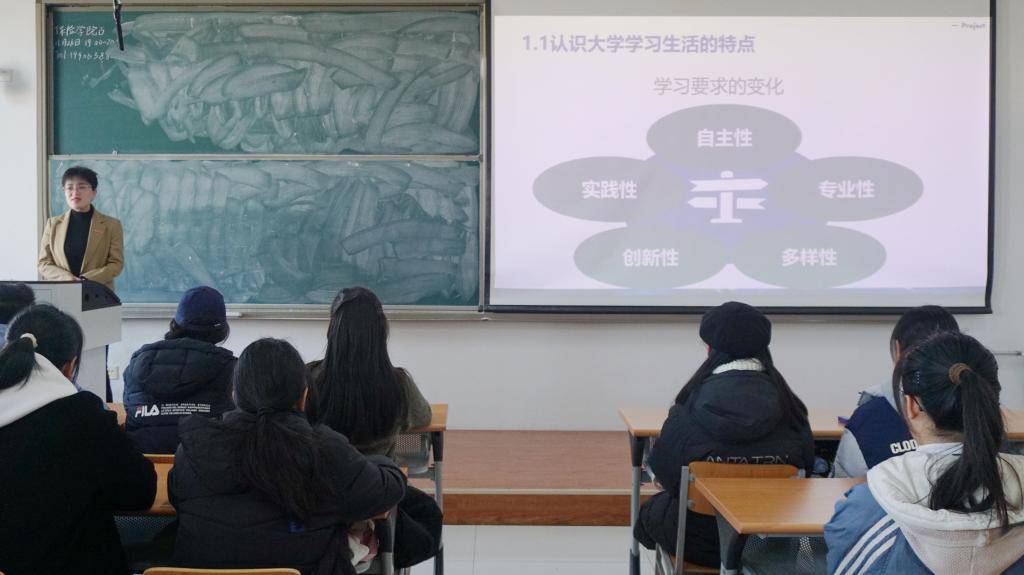 会上,滕晖首先了解了同学们目前对大学生活的感受和对未来的预期,随后,她聚焦当下大学生关心的问题,从认识大学、悦纳自己、知晓社会、规划未来四个方面展开讲解,帮助大学生更好地制定发展计划。她阐明了大学学习与生活方面的变化,着重强调了大学生应有的核心素养,并采用趣味的心理测试,让学生在选择中了解自己、探寻真我,明晰人格发展与职业选择的密切联系。滕晖通过实际调查数据呈现当今社会行业行情与就业要求,为同学们的职业规划提供实用参考信息。最后,滕晖建议大一新生加强日常时间管理,注重进行自我探索,提前做好生涯规划,实现个人的全面发展。